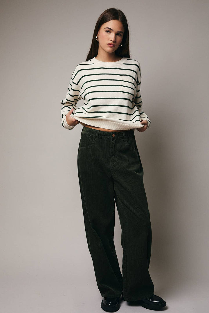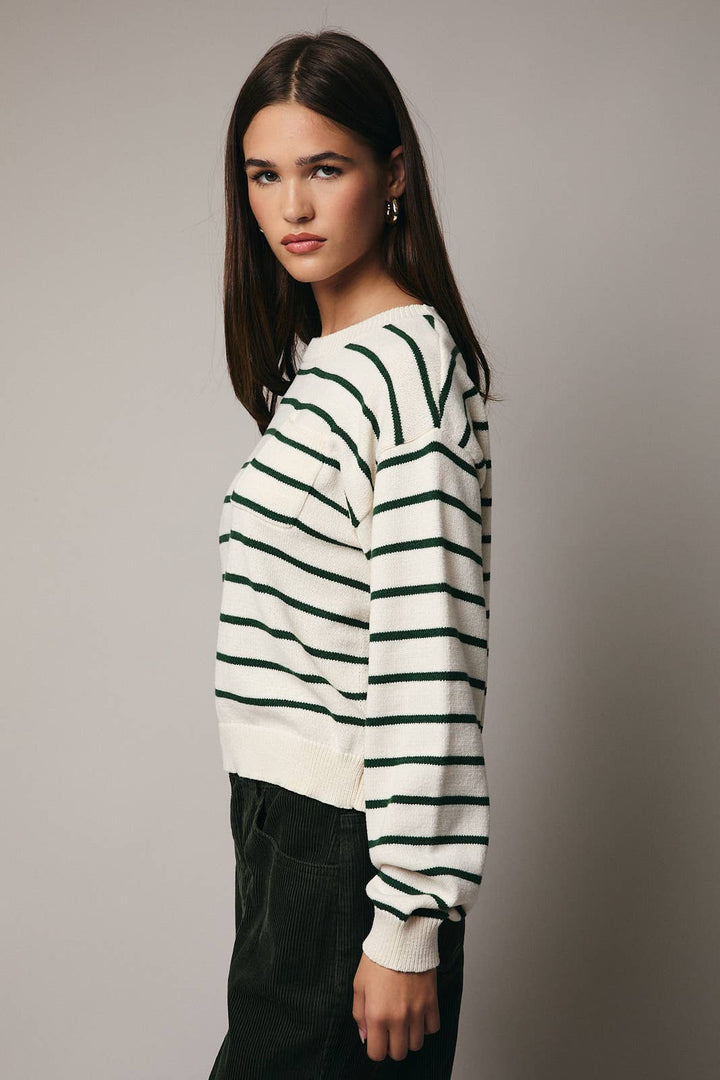 ROUND NECK RAGLAN LONG SLEEVE STRIPE POCKET SWEATER OH