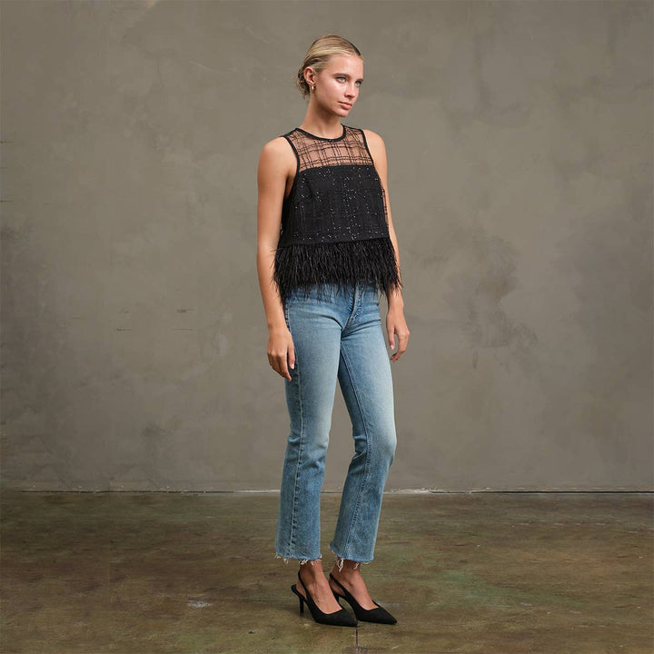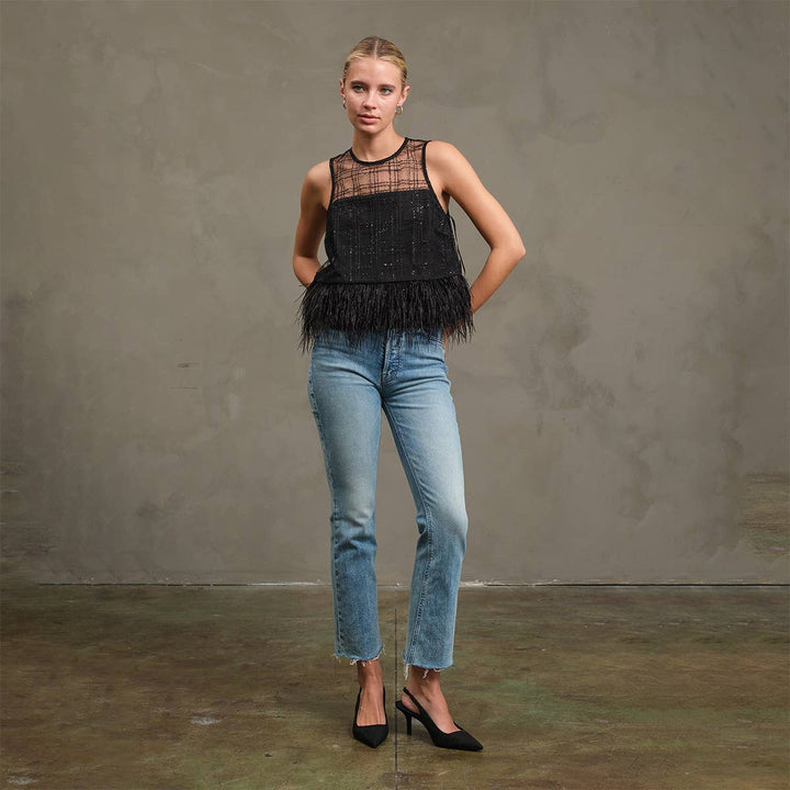 Elevate your look with this festive-meets-chic feather trim top. -Sheer plaid mesh yoke with subtle sparkle -Fully lined bodice for comfortable wear -Feather trim at hem for a glamorous, playful touch -Back neck keyhole closure -Perfect for holiday parties, night outs, or dressing up your favorite denim. ** Model is wearing size S Model height: 173 cm / 5FT 8IN 100%polyester