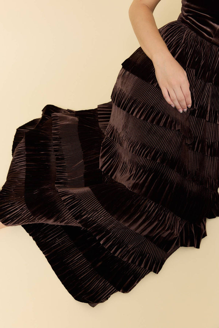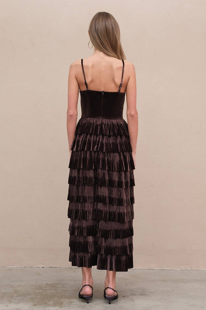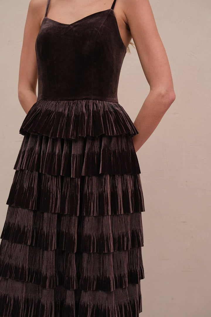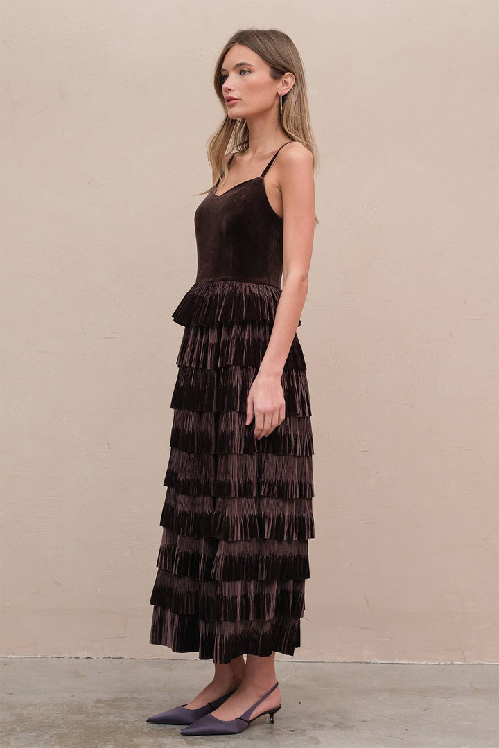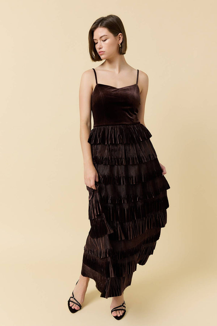 -Velvet pleated tier dress -Side invisible zipper -Adjustable shoulder strap -Full lined ** Model is wearing size S
